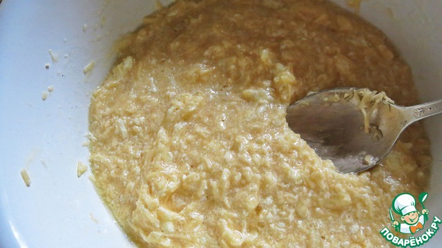 Добавить яйца. Хорошо перемешать. Сыр натереть на мелкой терке и добавить в яично-масляную смесь.