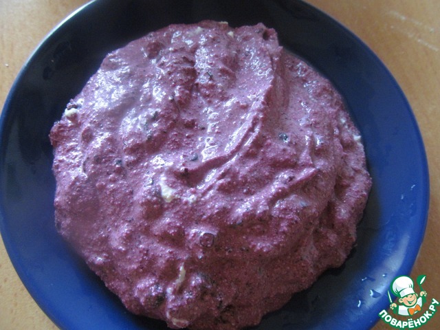 6. Творог взбить с несколькими ложками сливок и сахаром. Раздеть на две части. В одну добавить чернику