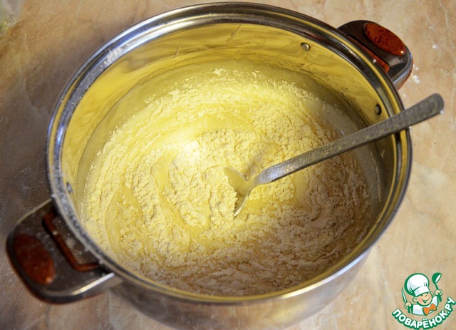 Снять с бани и постепенно добавлять просеянную муку. Мешать сначала ложкой, пока масса не станет тягучей, затем можно и руками.