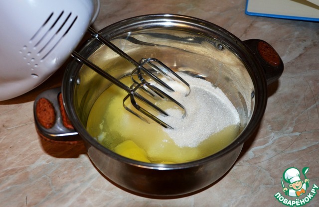 Высыпаем в кастрюлю сахар, добавляем яйца и взбиваем смесь миксером до белой пены.