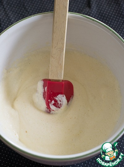Всыпать просеянную муку и тоже аккуратно лопаткой ее вмешать в муку.