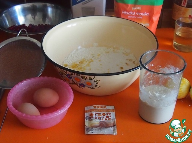В теплом молоке размешать дрожжи, ложку сахара и ложку муки, подождать до образования шапочки. Просеянную муку смешать с остальным сахаром, солью, цедрой лимона и желтками.