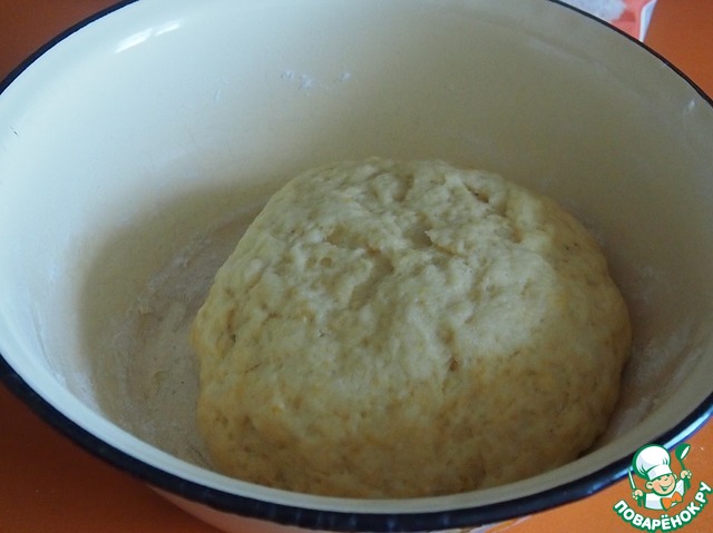 Добавить дрожжи и подсолнечное масло, замесить тесто. Тесто будет довольно плотное. Накрыть полотенцем миску с тестом и поставить его в теплое место на 45 минут. Тесто должно увеличиться примерно вдвое.