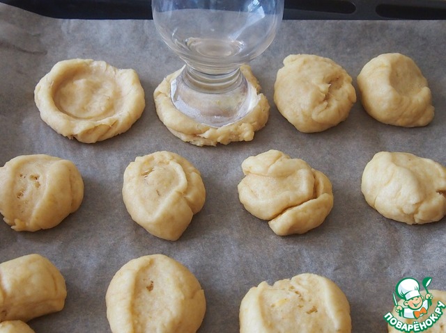Тесто разделить на одинаковые шарики и разложить их на противень, выложенный бумагой для выпечки. У меня вышло 20 штук. Оставить их на расстойку на 15 минут. Потом донышком стакана или рюмки (нужно его периодически макать в муку, чтобы не прилипало к тесту) сделать в шариках углубления.