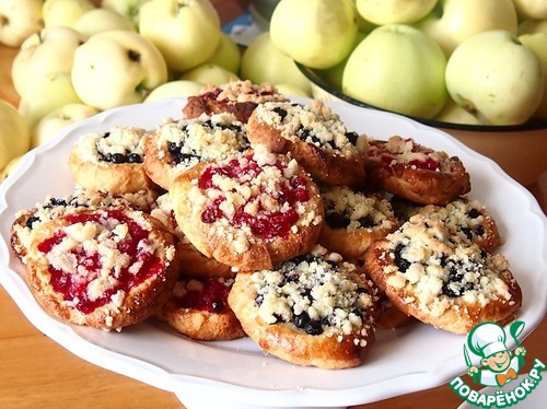 Посыпать ватрушки штрейзелем и отправить их в разогретую духовку. Печь при температуре 180 градусов 15 минут.