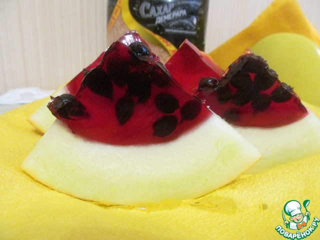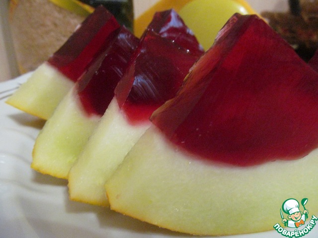 5. Желатин поставить на огонь, влить сок, на маленьком огне держим до растворения. Не кипятить. В дыню заливаем сок.