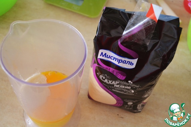 Соединяем яйцо с сахаром и пробиваем миксером, пока масса не посветлеет. Она должна увеличится в объеме, а сахар полностью раствориться. (Мой секрет - это взбивать в высоком стакане со щепоткой соли и парой капель лимонного сока или лимонной кислоты)