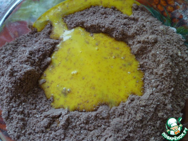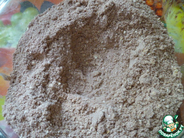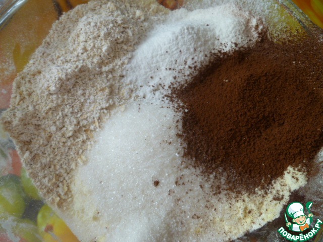 Добавляем сахар, ванильный сахар, измельченные овсяные хлопья, просеянные какао и крахмал.