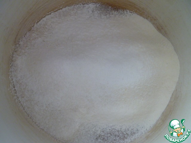 Соединить сухие ингредиенты: сахар, ванильный сахар, просеянную муку и крахмал.