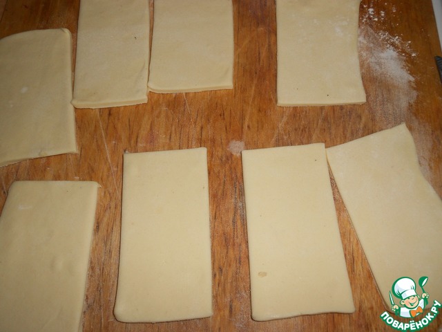 Раскатать слегка тесто и нарезать на 8 равных квадратиков.