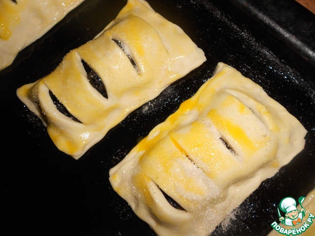 Заранее разморозить один пласт слоеного дрожжевого теста)