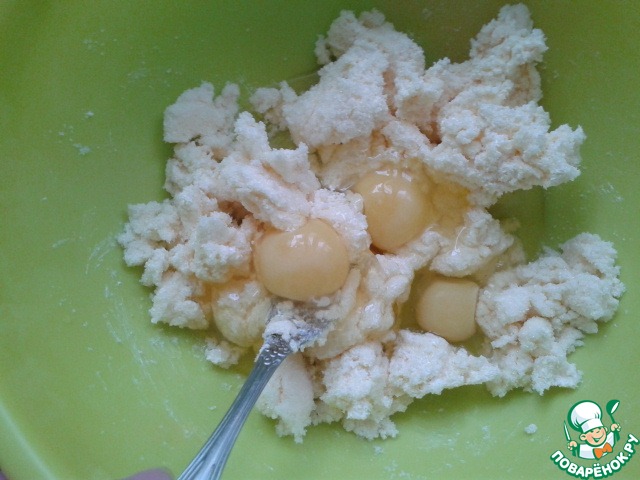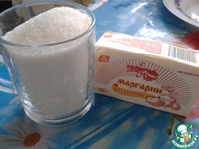Сахар растереть вилкой с мягким маргарином. Я это делаю в круглой миске, так удобнее потом венчиком работать.