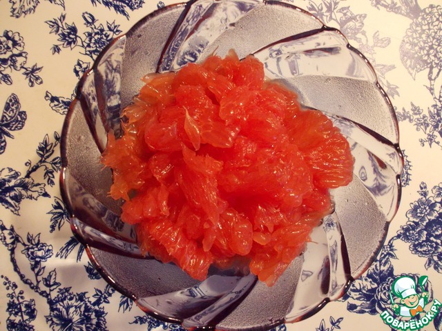 Грейпфрут очистить, наломать дольками, избавить от белых пленок, мякоть нарезать.