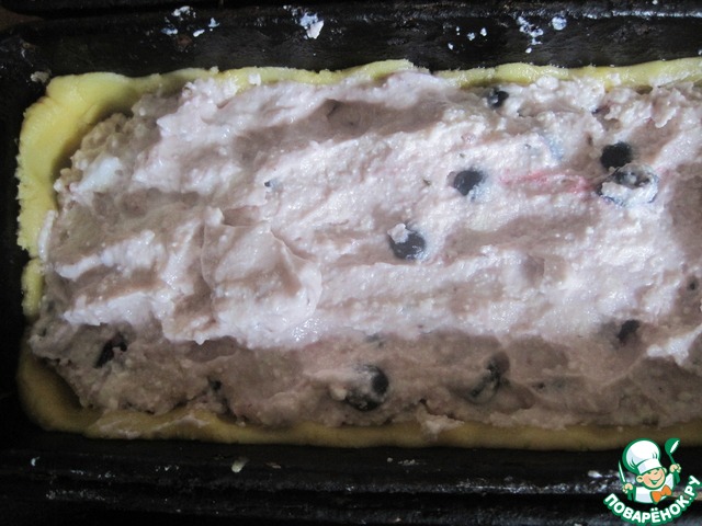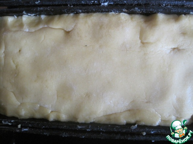Выкладываем 2/3 теста по стенке и дну формочки. Я использую форму для хлеба, так как готовила на даче, другой не было