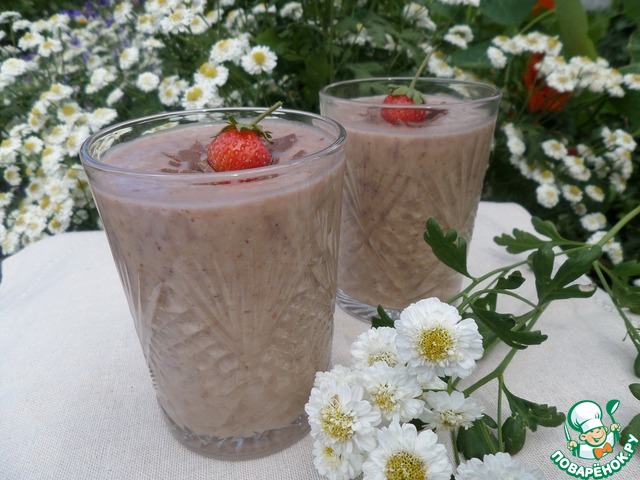 Разливаем по стаканам. Добавляем натертый шоколад и ягоды клубники. Подаем наш коктейль.