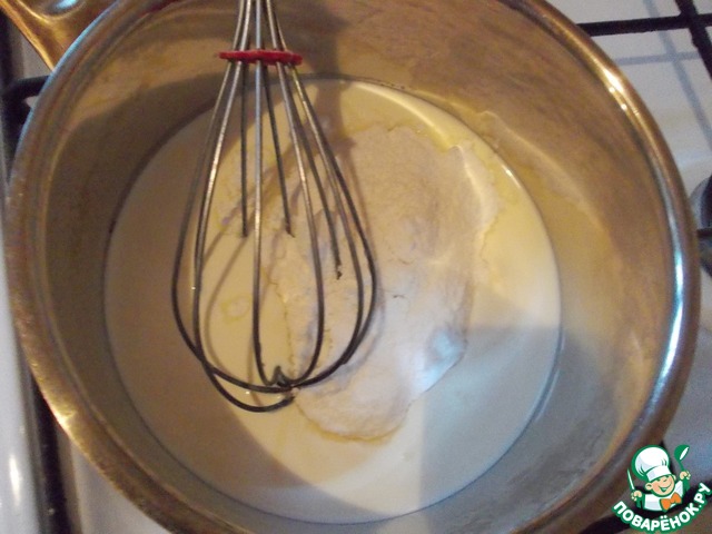 Сливки смешать с сахарной пудрой, поставить на огонь, довести до кипения, варить, помешивая, на медленном огне 5 минут.