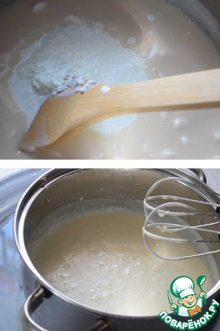 В другую кастрюльку выливаем вторую половину сливок и добавляем поломанный на мелкие кусочки зефир. На небольшом огне при постоянном помешивании растворяем зефир в сливках. Не обязательно ждать полного его растворения, небольшие кусочки потом разойдутся при сбивании. Снимаем кастрюльку с огня и содержимое остужаем до комнатной температуры.
