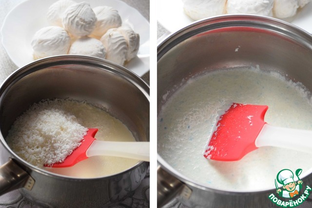В кастрюльку выливаем 250 мл сливок, доводим на медленном огне до кипения и добавляем кокосовую стружку. Хорошо перемешиваем и убираем охлаждаться до комнатной температуры.