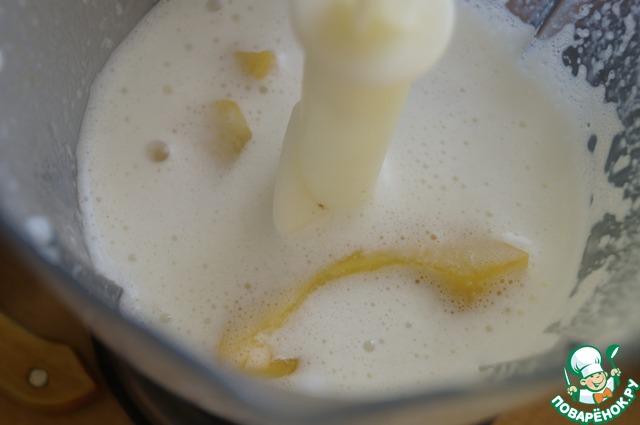 Добавить к молочному рису 3 половинки персика и снова взбить пару минут. Получится воздушная нежная масса. Желатин растворить в горячей воде до полного растворения. Влить желатин в рис и немного взбить.