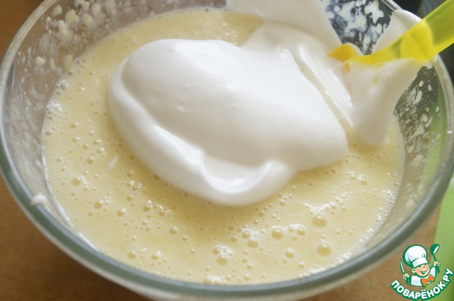 Приготовить итальянскую меренгу. Из сахара и воды сварить сироп температурой 120 градусов, если нет термометра, то можно определить готовность сиропа по крупным пузырям на поверхности.