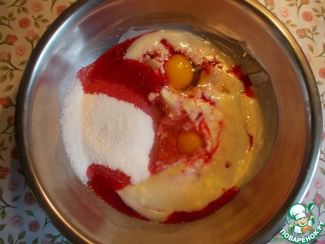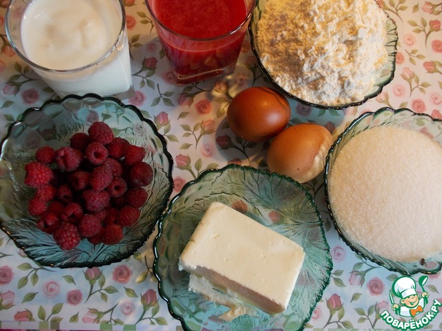 Растопленное сливочное масло соединить с 1 стаканом сахара, яйцами, кефиром и свежевыжатым соком малины, хорошо перемешать.