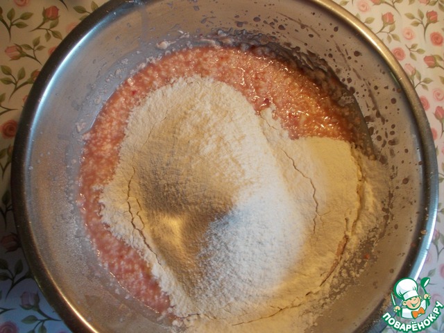 В полученную массу ввести просеянную с разрыхлителем муку, перемешать.