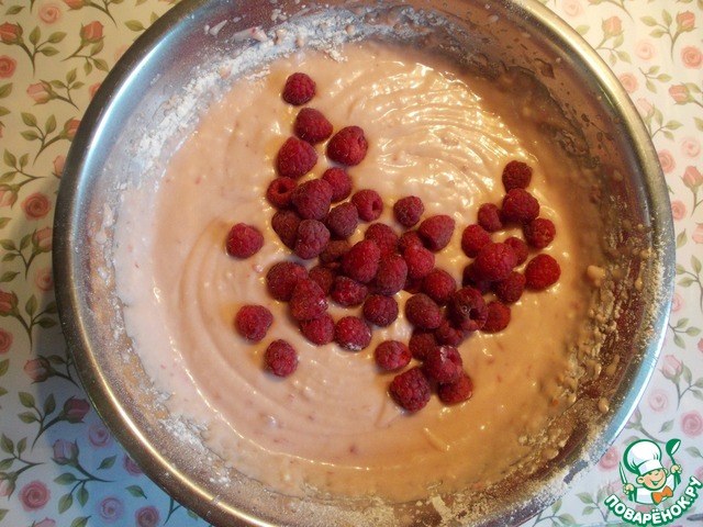 Добавить малину, перемешать, стараясь не раздавить ягоду.