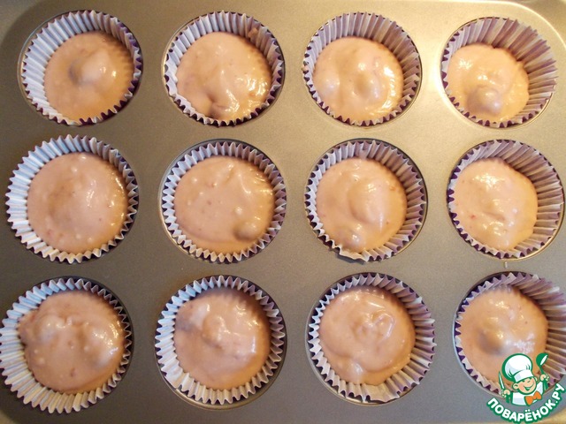 Выложить в каждую формочку для кекса 1 ст. л. теста. Затем - 1 ч. л. начинки.