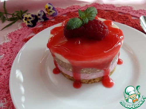 Подаем пирожное, сверху полив ягодным соусом ( ягоды, вода, сахар, крахмал) и украсив ягодами и мятой.