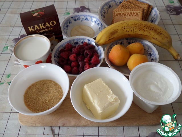 Достаем из холодильника формы с тестом из печенья. Ложкой выкладываем творожную массу с малиновым соком. Ставим в морозилку на 10 минут. Затем сверху выкладываем бананово-творожную массу. Ставим в морозилку на 10 минут. И завершающий слой - с абрикосовым соком. Затем ставим в холодильник на 40-50 минут.