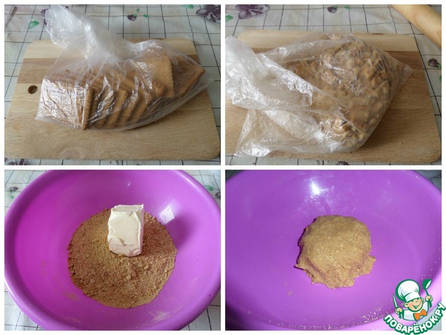 Печенье складываем в полиэтиленовый пакет и измельчаем с помощью скалки. ( Можно измельчить в блендере или пропустить через мясорубку). Крошку высыпаем в чашку, добавляем сливочное масло. Замешиваем "тесто".