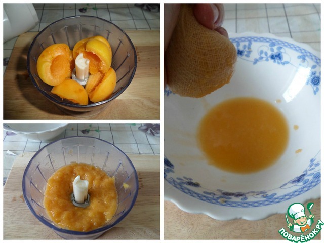 У абрикосов удаляем косточки и измельчаем в блендере. С помощью марли отжимаем сок.