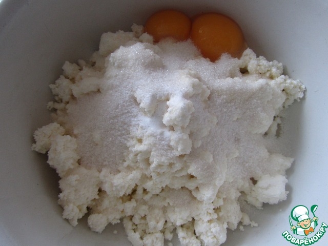 В творог добавить яйца, сахар, соль, ванилин и разрыхлитель. Все хорошо перемешать.