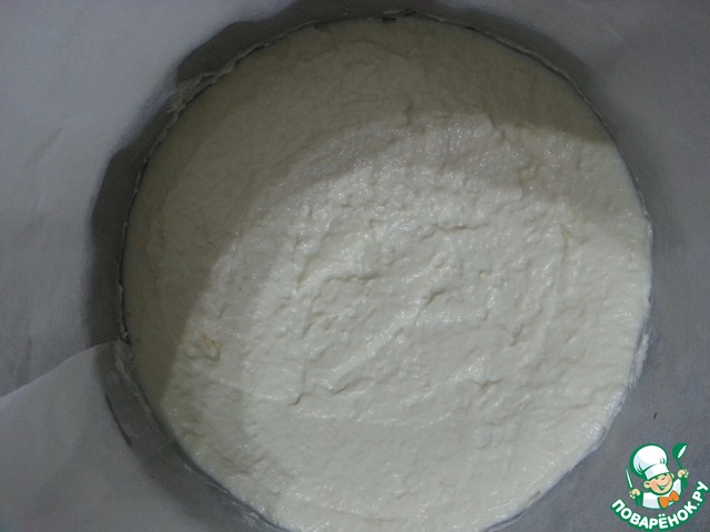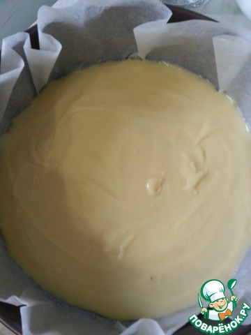 Выложить тесто в разъемную форму 23 см. в диаметре, выстеленную бумагой и разровнять. Выпекать 30 мин. Вынуть и дать остыть.