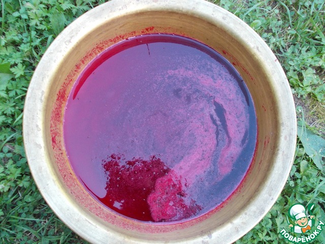 Смешать воду, свежевыжатый сок черной смородины и сахар, довести до кипения (я варила в медном тазу на даче), проварить 2 минуты.