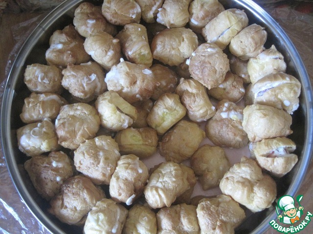 Укладываем профитроли в 2 ряда в кольцо. Кольцо диаметром 34 см