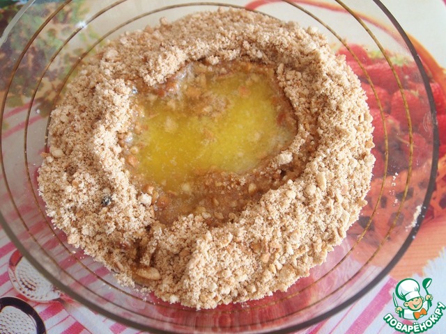 Переложить крошку в другую емкость. Сливочное масло растопить и добавить в крошку. Хорошо перемешать.