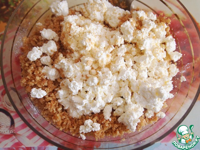 Далее добавить творог (у меня домашний) и сахарную пудру.