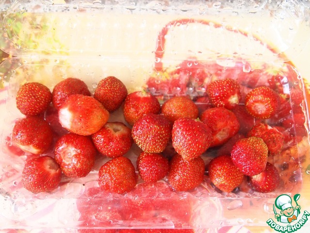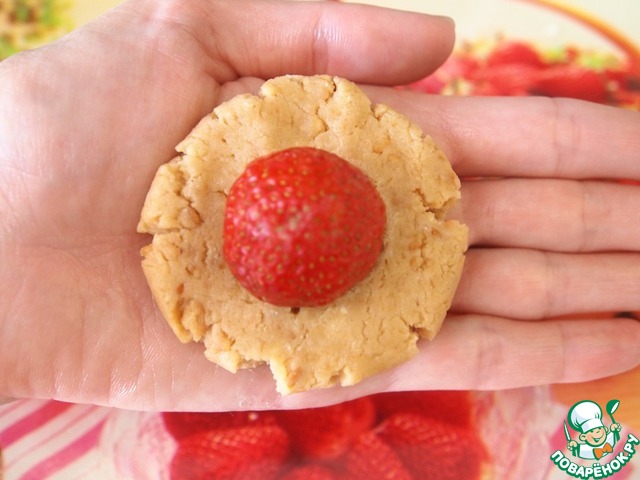 От теста отщипывать небольшой кусочек, скатать в шарик, примерно величиной с грецкий орех, размять его в лепешку. В серединку лепешки положить ягодку клубнички.