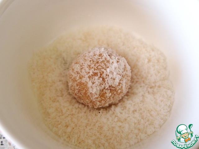 Каждый шарик обвалять в кокосовой стружке, выложить на блюдо и убрать в холодильник на 20 минут, для застывания.