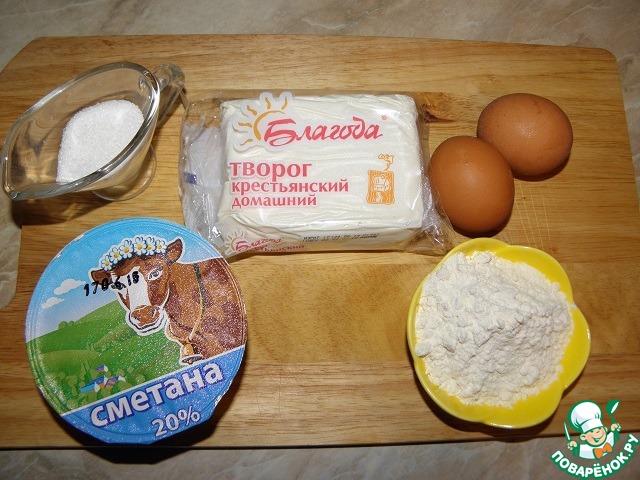 Продукты. Количество продуктов рассчитано на одну, можно чуть больше пачку творога, увеличивать по своему желанию. Первым делом включаем духовку 200-220%, ставим туда противень (если надо застелить бумагой) чтобы он прогрелся.