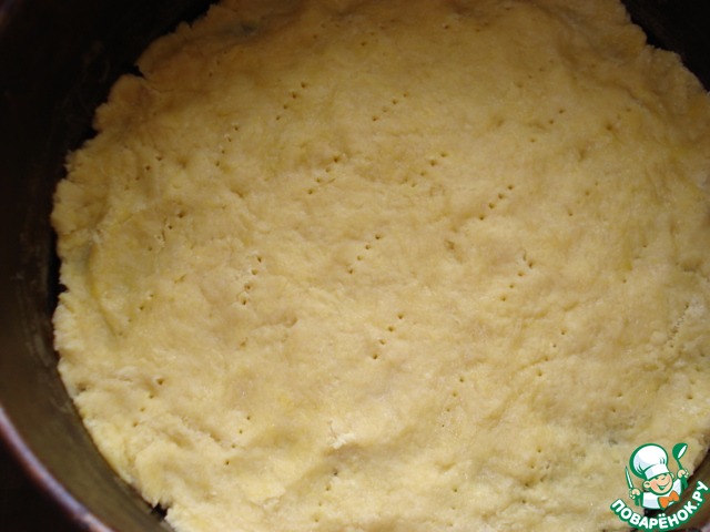 Затем распределить тесто в форме для выпечки и наколоть вилкой.
