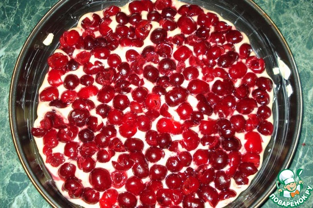 По рецепту форму нужно застелить пергаментом и смазать сливочным маслом, но я обошлась без пергамента, обильно смазав форму маргарином. Тесто выкладываем в форму (не волнуйтесь, что самого теста мало, ибо во время запекания оно хорошо поднимется) и сверху высыпаем вишню, "вдавив" ее руками в тесто. Ставим в заранее разогретую духовку при температуре 180°С на 40-45 минут.