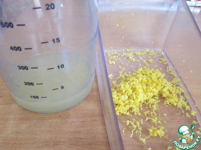 Лимон вымыть. Натереть цедру на мелкой тёрке. Выжать сок из лимона (50 мл)