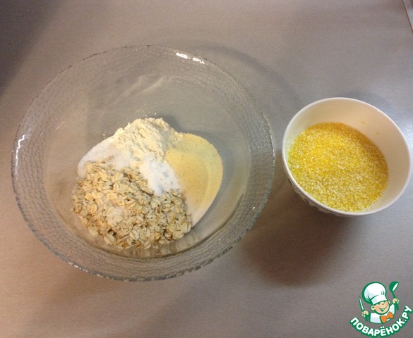 Муку, манку, мюсли, сахар ванильный, соль, соду. Перемешиваем.