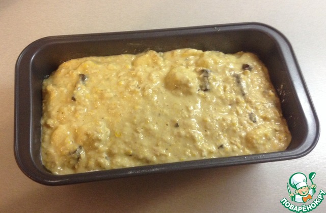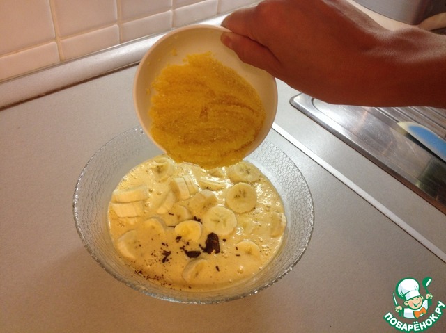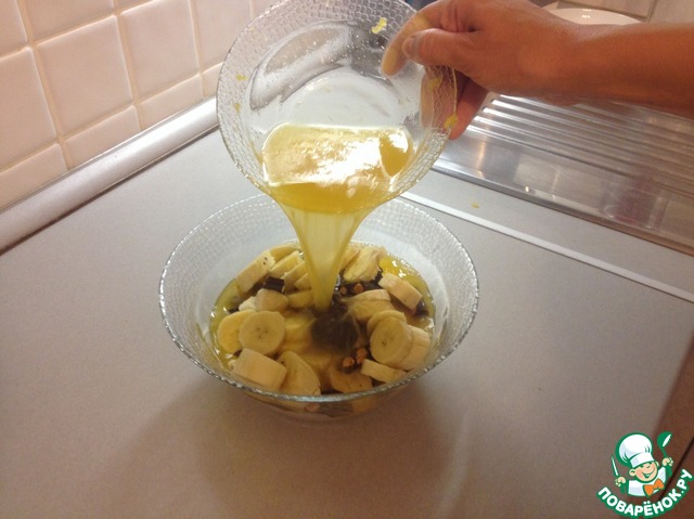 Добавляем в тесто нарезанные толстыми кружочками бананы, апельсиновую цедру, небольшими кусочками добавляем шоколад и заливаем соком двух апельсинов, смешанного с медом. Хорошо перемешиваем.