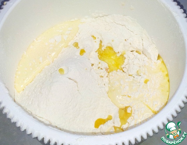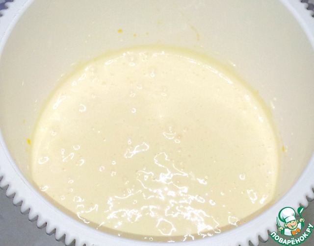 В яично сахарную смесь всыпала просеянную муку, ванильный сахар, разрыхлитель теста, вылила жидкое сливочное масло и переложила густую сметану. Тесто перемешала в блендере до однородного состояния.