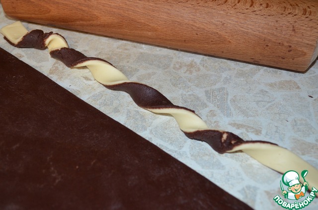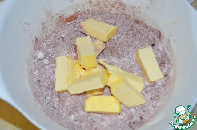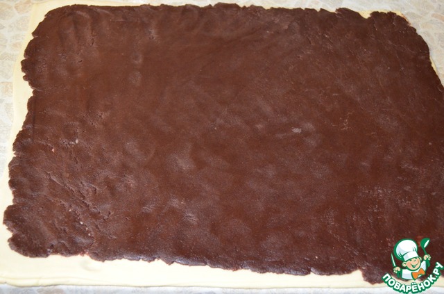Шоколадное песочное тесто распределить ровным слоем на слоеном тесте и хорошо прижать.