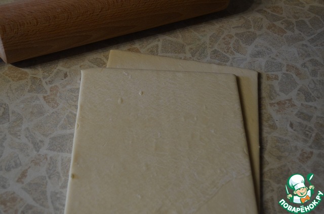 В это время разморозить слоеное тесто. Пласты теста положить друг на друга и раскатать на слегка посыпанной мукой рабочей поверхности в прямоугольник. Белок взбить и смазать им раскатанное тесто. Противень смазать или выложить бумагой для выпечки. Нагреть духовку до 200 градусов.