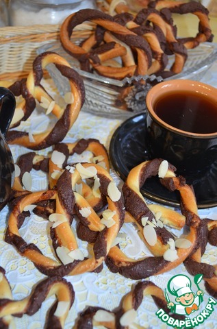 Смешать сахарную пудру с 2 ст/л горячей воды. Смазать полученной глазурью горячие крендельки и сразу же посыпать миндальными хлопьями.